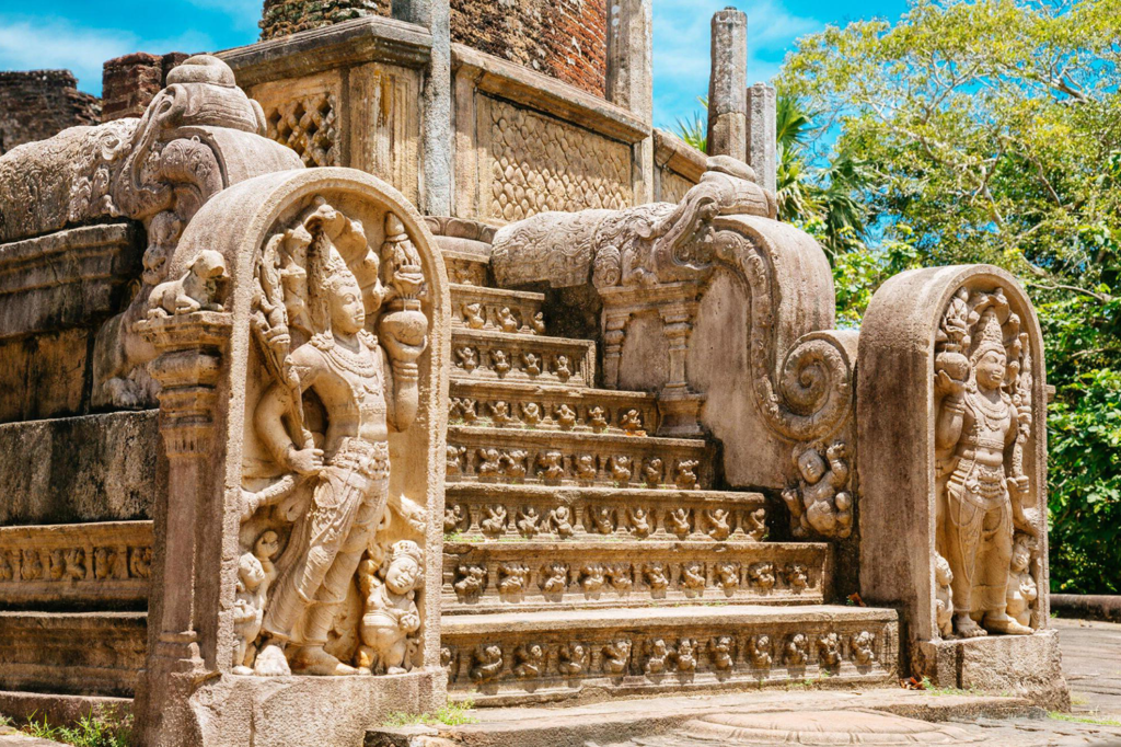 One of the main attractions in Polonnaruwa is the “Gal Viharaya.” This site features two seated Buddha statues, a standing statue, and a statue in a Parinirvana Manchakaya, all carved from a single massive granite rock.